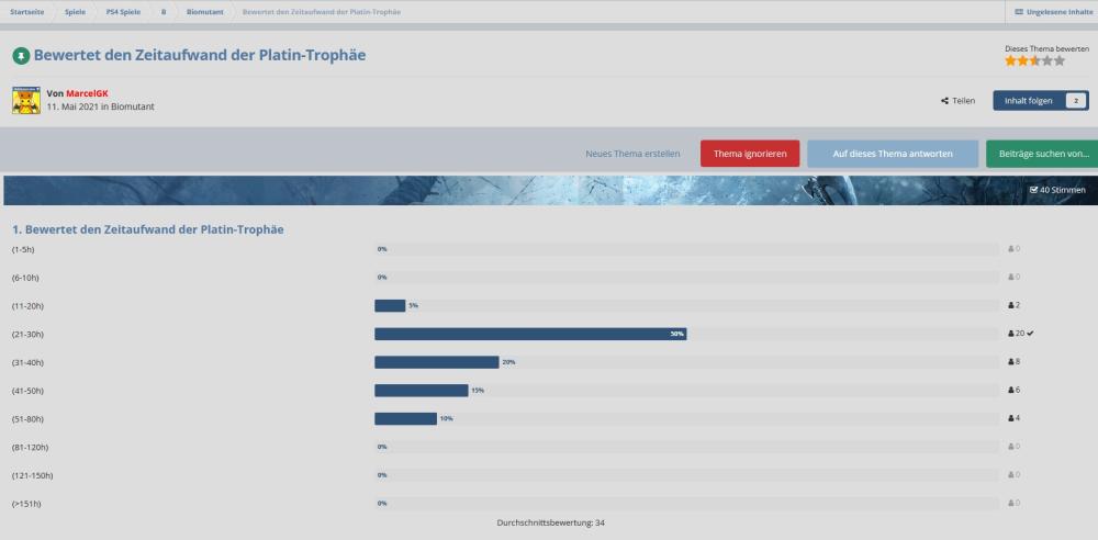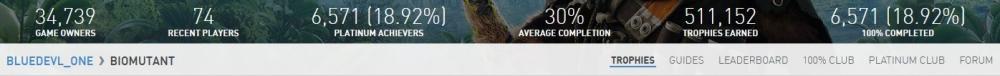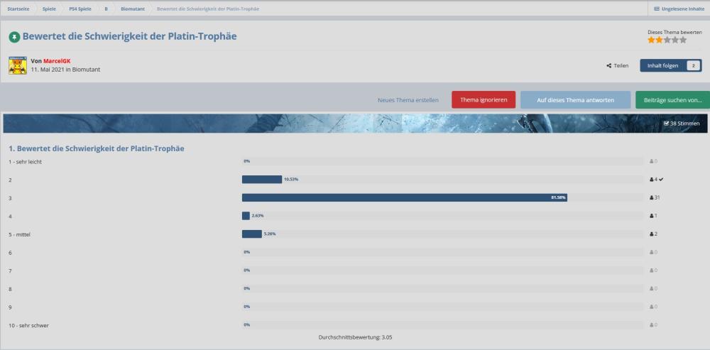 BlueDevls Reise zur Foren-Platin 2023BlueDevl antwortete auf BlueDevl's Thema in: Bau dir deine eigene Platin 2023 Ich habe das Spiel "Biomutant (PS4)" abgeschlossen und damit folgende Foren-Trophäen erspielen können: Komplettiere ein Spiel mit einer Komplettierungsrate von 05,01 - 24,99%. Komplettiere ein Spiel mit einer Schwierigkeit von 1,00 - 3,99. Komplettiere ein Spiel mit einer Spielzeit von 20,00 - 39,99 Stunden. Komplettiere ein Spiel, in dem du mit einem Tier interagierst. Bewerte Spaß, Dauer und Schwierigkeit eines im Event komplettierten Spiels. Komplettiere ein Spiel aus der Liste eines anderen Mitspielers. Komplettiere ein Spiel aus dem letzten Event. Die Screenshot-Foren-Trophäen sind nicht nur aus Biomutant, sondern von einigen weiteren Spielen. Erreiche drei verschiedene Berggipfel. Nimm drei verschiedene Mahlzeiten ein. Wasser ist so vielseitig. Entdecke einen Regenbogen. Mach ein Feuer. Werde Millionär Habe über alle Spiele hinweg 100 Heilmittel. Erreiche in einem Spiel Level 10. Erreiche in einem Spiel Level 30. Kleide dich völlig unpassend für das Geschehen um dich herum. Spiel ein Instrument. Zeige Vergangenheit, Gegenwart und Zukunft. Mach einen Screenshot von einem noch nicht erkannten Fortbewegungsmittel. So, reicht erst einmal. Weitere Fertigmeldungen kommen dann später.