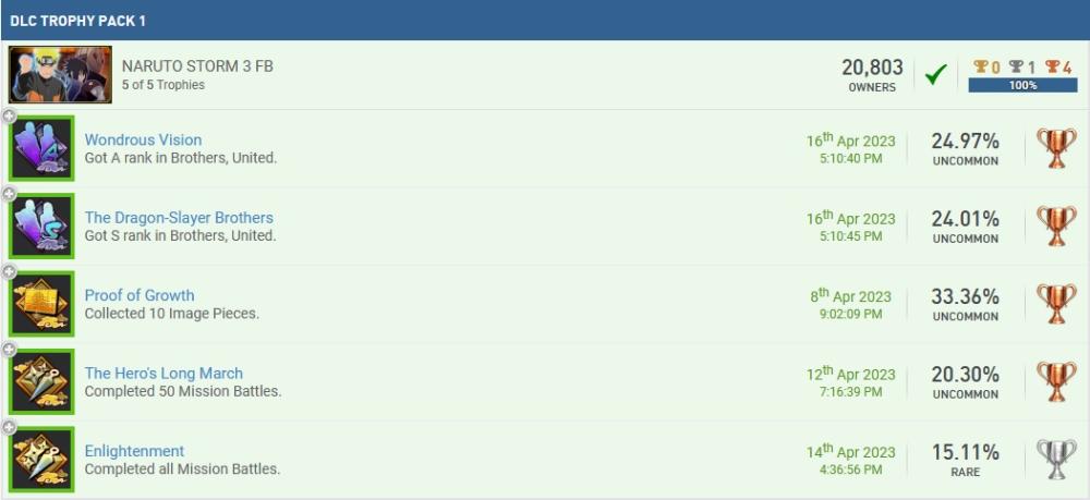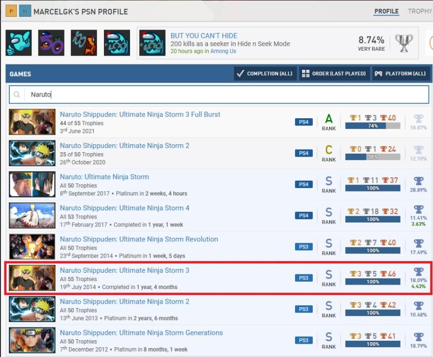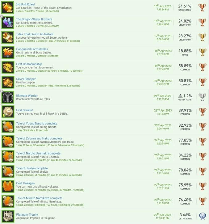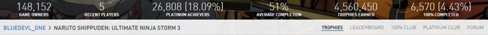 BlueDevls Reise zur Foren-Platin 2023BlueDevl antwortete auf BlueDevl's Thema in: Bau dir deine eigene Platin 2023 Ich habe das Spiel "Naruto Shippuden Ultimate Ninja Storm 3 (PS3)" abgeschlossen und damit folgende Foren-Trophäen erspielen können: Komplettiere ein Spiel mit einer Komplettierungsrate von 05,01% - 24,99%. Komplettiere ein Spiel mit einer Schwierigkeit von 1,00 - 3,99. Komplettiere ein Spiel, das zwischen Anfang 2020 und Ende 2021 gestartet und bis Eventbeginn nicht beendet wurde. Komplettiere ein DLC Pack. Komplettiere ein Spiel aus einer Reihe in der du mindestens eine Platin/100% hast. Bewerte Spaß, Dauer und Schwierigkeit eines im Event komplettierten Spiels. Komplettiere ein Spiel aus der Liste eines anderen Mitspielers. Mit Abschluss dieses Spiels konnte ich auch noch die folgenden Foren-Trophäen erspielen: & Komplettiere drei Spiele mit unterschiedlichen Genres. Komplettiere drei Spiele mit unterschiedlichen Release Jahren. Erspiele eine Foren-Trophäe aus allen Blöcken.