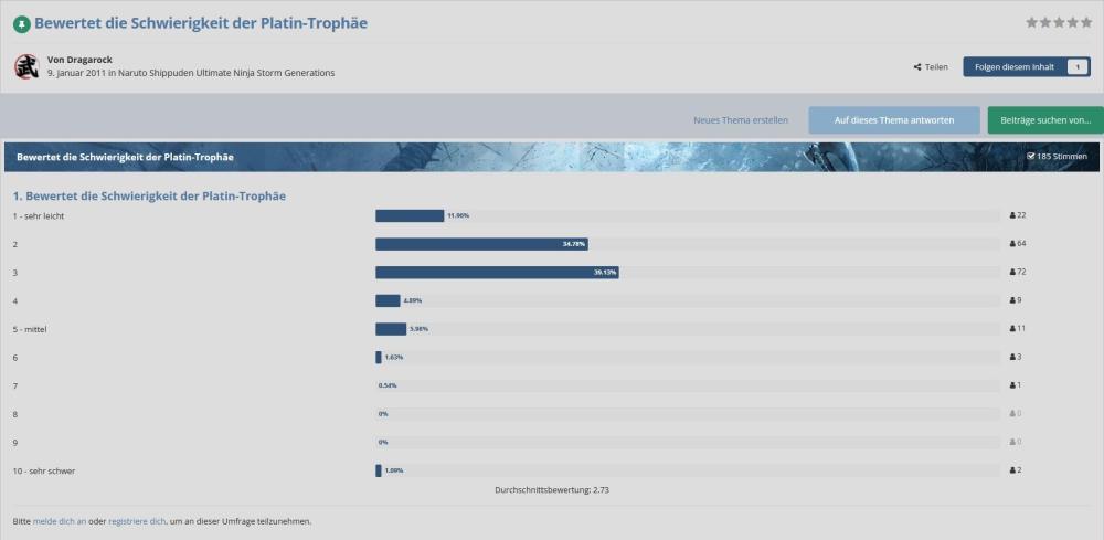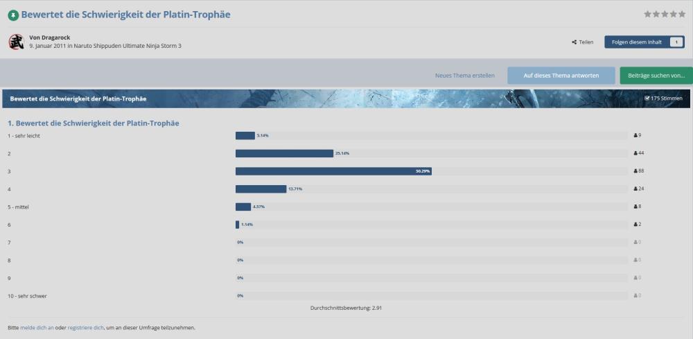 Bewertet die Schwierigkeit der Platin-TrophäeBlueDevl antwortete auf Dragarock's Thema in: Naruto Shippuden Ultimate Ninja Storm 3 Der Großteil des Spiels würde bei einer 2-3 liegen. Dadurch, dass der Endkampf auf S-Rang allerdings so herausfordernd ist, bekommt das Spiel eine Aufwertung auf 4 Punkte von mir.