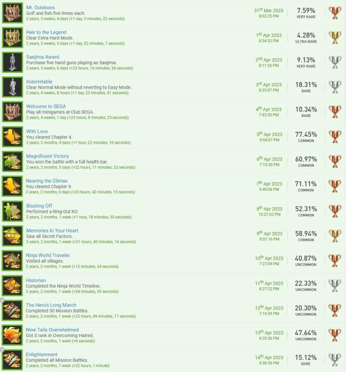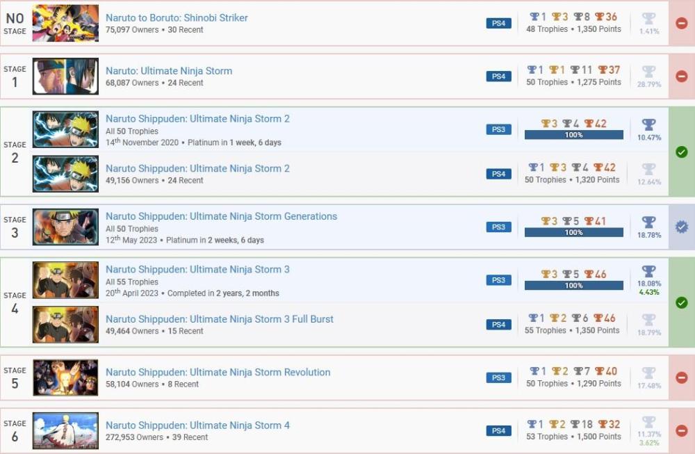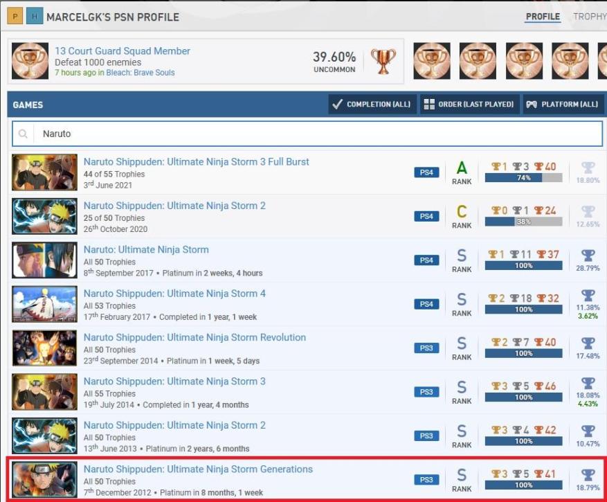 BlueDevls Reise zur Foren-Platin 2023BlueDevl antwortete auf BlueDevl's Thema in: Bau dir deine eigene Platin 2023 Ich habe das Spiel "Naruto Shippuden Ultimate Ninja Storm Generations (PS3)" abgeschlossen und damit folgende Foren-Trophäen erspielen können: Komplettiere ein Spiel mit einer Komplettierungsrate von 05,01 - 24,99%. Komplettiere ein Spiel mit einer Schwierigkeit von 1,00 - 3,99. Komplettiere ein Spiel mit einer Spielzeit von 20,00 - 39,99 Stunden. Komplettiere ein Spiel aus einer Reihe in der du mindestens eine Platin/100% hast. Komplettiere zwei Spiele aus einer Spielereihe. Bewerte Spaß, Dauer und Schwierigkeit eines im Event komplettierten Spiels. Komplettiere ein Spiel aus der Liste eines anderen Mitspielers. Erspiele fünf Trophäen die "First/Erster/Start" beinhalten. Stirb 100 Mal