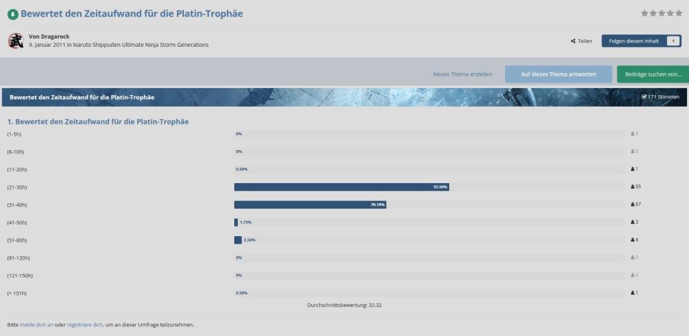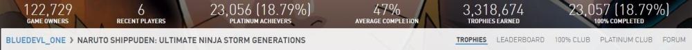 Bewertet den Zeitaufwand für die Platin-TrophäeBlueDevl antwortete auf Dragarock's Thema in: Naruto Shippuden Ultimate Ninja Storm Generations Nach 15-16 h hatte ich so ziemlich alles erledigt. Musste dann noch einige Ninja Karten freispielen, was mich nochmal gute 5 h gekostet hat. Der Rest war dann noch abwarten, bis die letzte Trophäe (30 h spielen) kam. Daher waren es genau 30 h bis die Platin erspielt wurde.