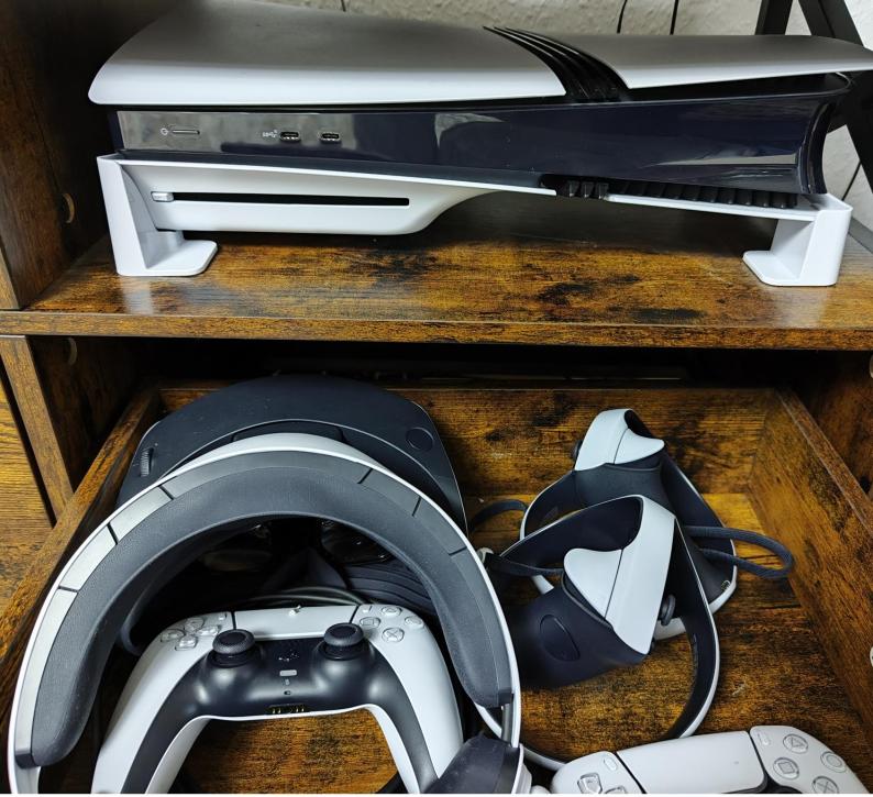 Da liegt das Rudel. PS5Pro-Disk + PSVR2 nebst Controllern in ruhiger Eintracht des Lowboard sowie der darunter liegenden Schublade