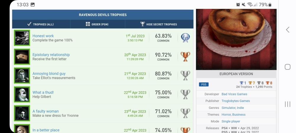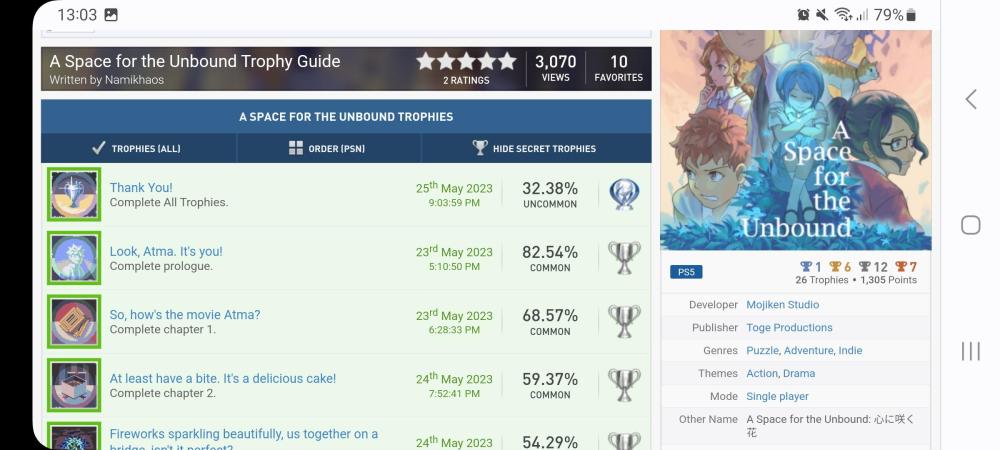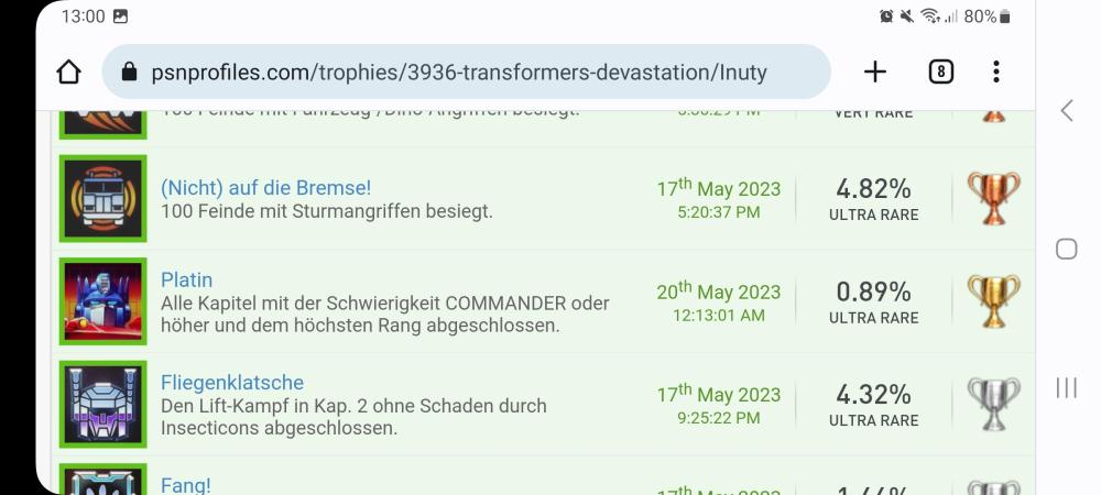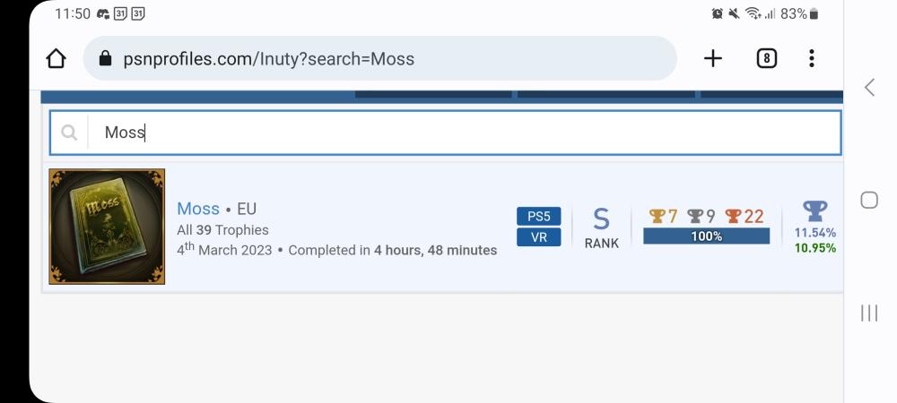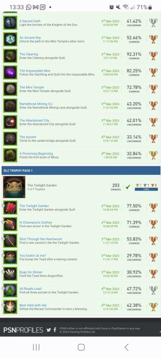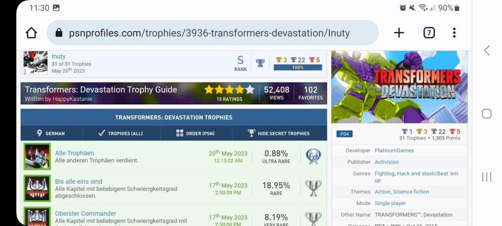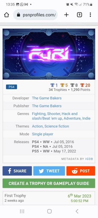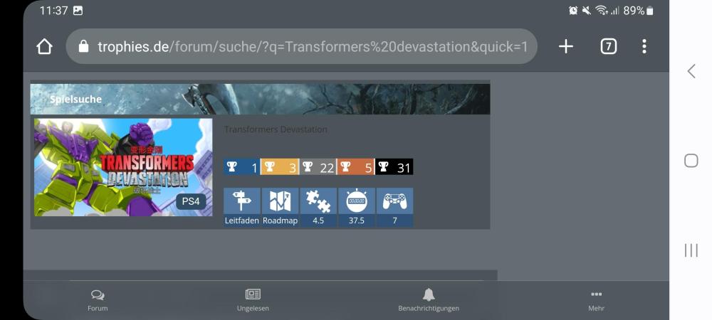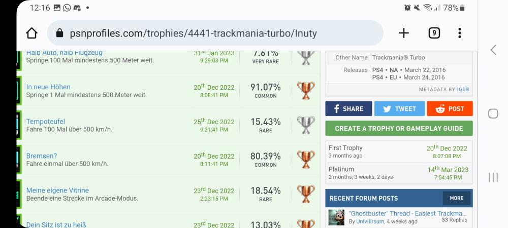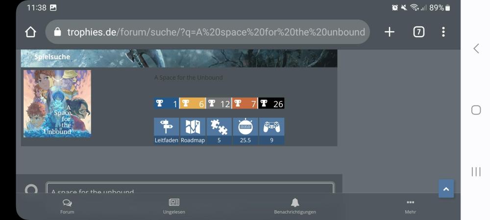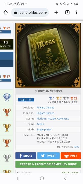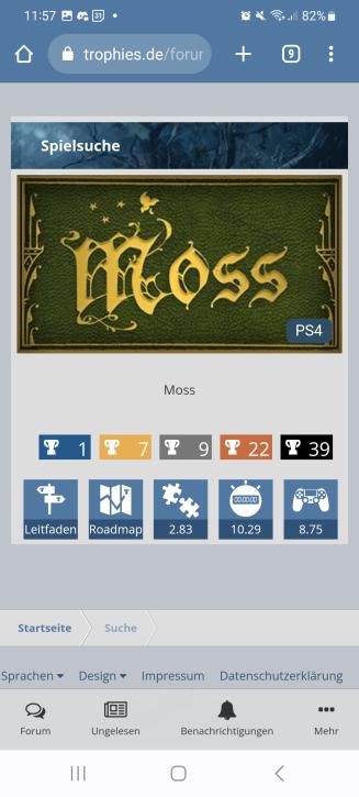 Trackmania Turbo - Augen von meinem Bildschirm - ich habe die Trophäe mit meine Schwager erspielt. Man kann sie im Splitscreen erspielen und Splitscreens erzeugen bei mir immer das Familien gefühl, da man hierfür im gleichen Raum sein muss und nicht nur über Internet verbunden ist Trackmania Turbo - 2 Fahrer ein Auto - gleiche Begründung wie oben Moss - Gemeinsam sind wir Zweisam - selbst wenn man nur noch ein Familienmitglied hat ist es dennoch eine Familie. Ich fand die Beschreibung ganz schön und dachte es passt hier sehr gut rein Moss - Gut gemacht, mein Freund - die Beschreibung erinnert mich daran, dass man die Erfolge eines Familienmitglieds immer Wertschätzen und äußern sollte. Im Spiel klatsch man mit Quill ab, weil er eine Passage geschafft hat. Dieses Teamgefühl ist auch in der Familie zu finden Furi - Willkommen zurück, Reisender - für mich hat es etwas mit Familie zu tun, weil ich sehr weit weg von meiner Familie wohne. Es ist immer wieder schön zurück zu kommen und das Gefühl tu kriegen, als wäre man nie wirklich weg gewesen Alle Trophäen Bilder kommen aus Moss und beinhalten eine Maus: - Ich habe keine Angst - Beschützer des Reiches - Kein Streichelzoo - Idiurus Macrotis - Danke. Alle Genres wurden aus PSNP genommen: - Tony Hawk Pro Skater 1+2 - Sport - Moss - Puzzle - Furi - Fighting Tony Hawk Pro Skater 1+2 (PS5) - 2021 Moss (PS5) - 2023 Furi (PS4) - 2016 Alle Spiele sind 2023 rausgekommen: Job Simulator (PS5) Moss (PS5) Pistol Whip (PS5) Foren Trophäen aus Neue Spiele, Backlog Spiele und Easter Eggs erspielt. Alle gemeldeten Einträge sollten über 30 Foren Trophäen ergeben Mit den Meldungen sollte ich schon mal 5 € gespendet haben und Bronze Tier erreicht haben -