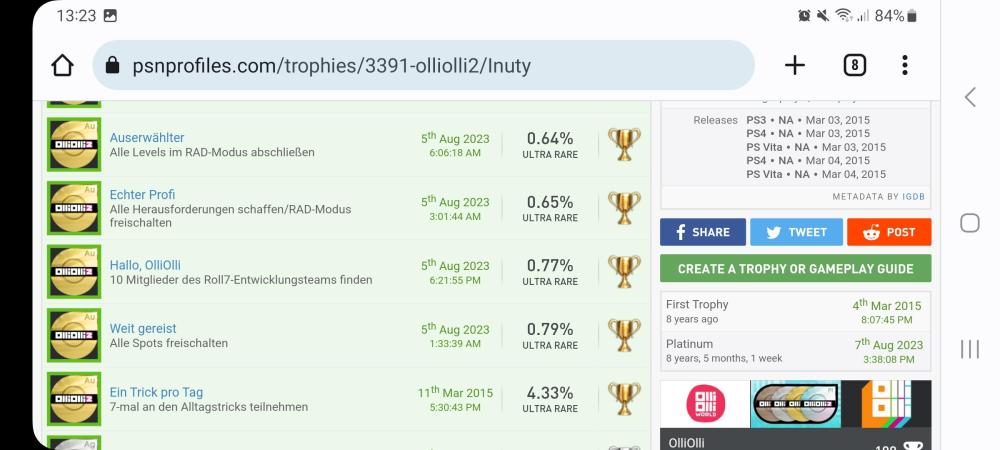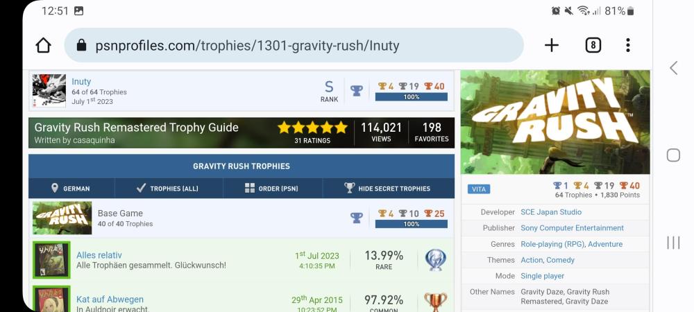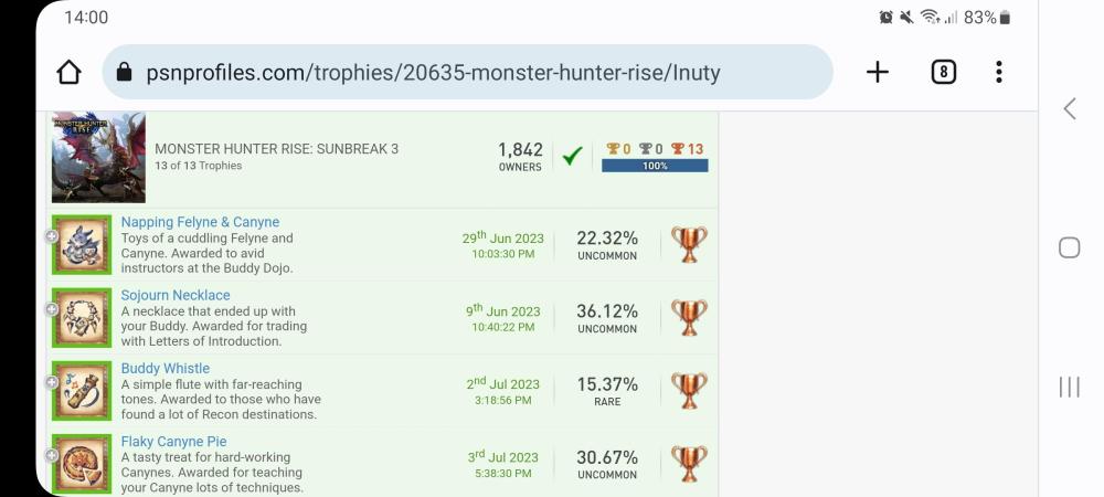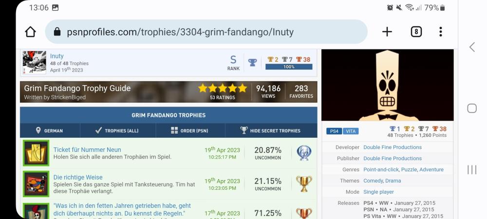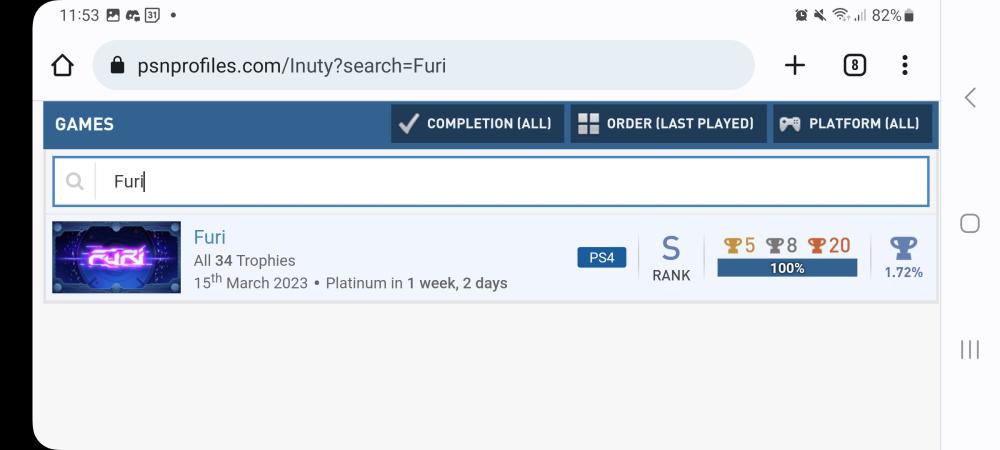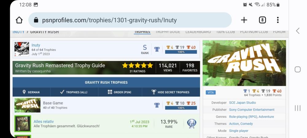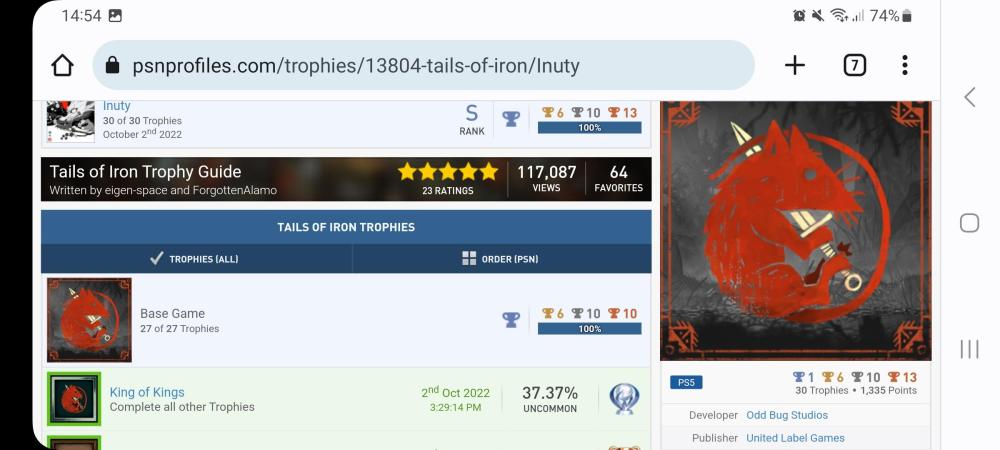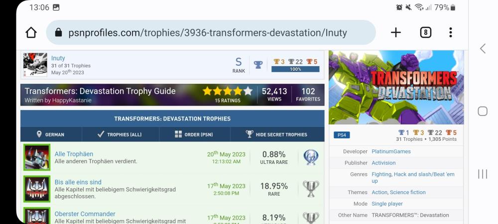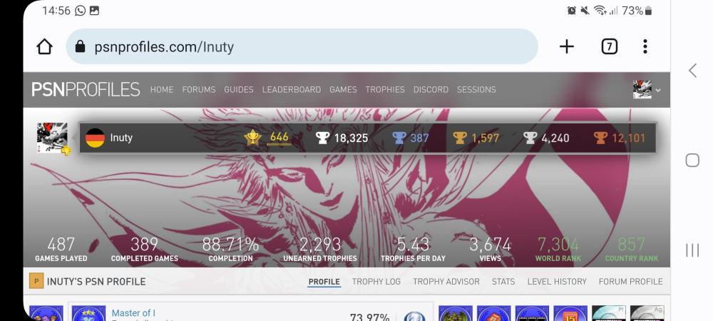 Hi ich bin @Inuty und das hier ist meine Reise zur Foren-Platin 2023! Mein PSN-Nick ist: Inuty Hier ist mein aktueller Punktestand: Inutys Punktetafel Meine aktuelle Komplettierungsrate beträgt: 87,68% (psnp) Meine Lieblingsgenres sind: Adventure Rollenspiele Indie Unpopulär dagegen ist folgendes Genre bei mir: Racing Folgende 3 Neue Spiele würde ich gern abschließen: Monster Hunter Iceborn Like a Dragon Ishin! The Legend of Heroes: Trails to Azure Folgende 3 Backlog Spiele würde ich gern abschließen: Trackmania Turbo Gravity Rush Beyond Two Souls Folgende 3 Koop-Titel würde ich gern abschließen: - Folgendes Abzeichen ist mein Ziel: Gold