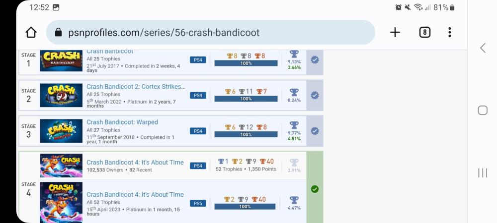 Es ist schon etwas länger her seit meinem letzten Update. Auf Grund anderer Events auf PSNP halte ich gerade einige Platins zurück, aber ich werde nochmal ein großes Update vor Ende machen. Da mein Ziel für Gold etwas schwer wird momentan, kommen mir die Spendenbounties gerade recht! Bevor ich das vergesse poste ich die Sachen aber lieber jetzt gleich Wie im allgemeinen Thread beschrieben, sind diese vor dem 01.05 erspielt wurden und zählen nicht für den 10€ PSN Code, aber immerhin für die Spenden und bringen so meine erzockten Spenden in die Höhe Meine Bounties bisher: Crash Bandicoot 4: Its about Time - 20€ Trackmania Turbo - 15€ Tony Hawks Pro Skater 1+2 - 5€ -