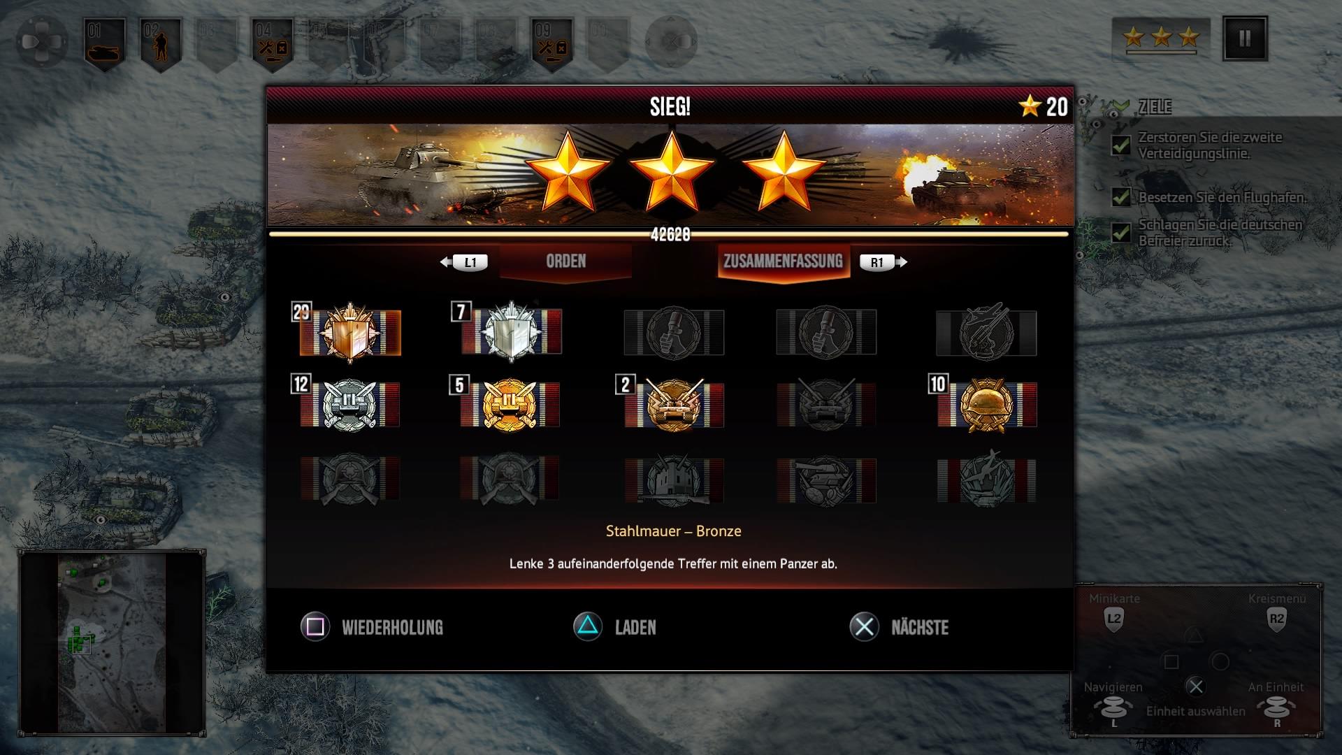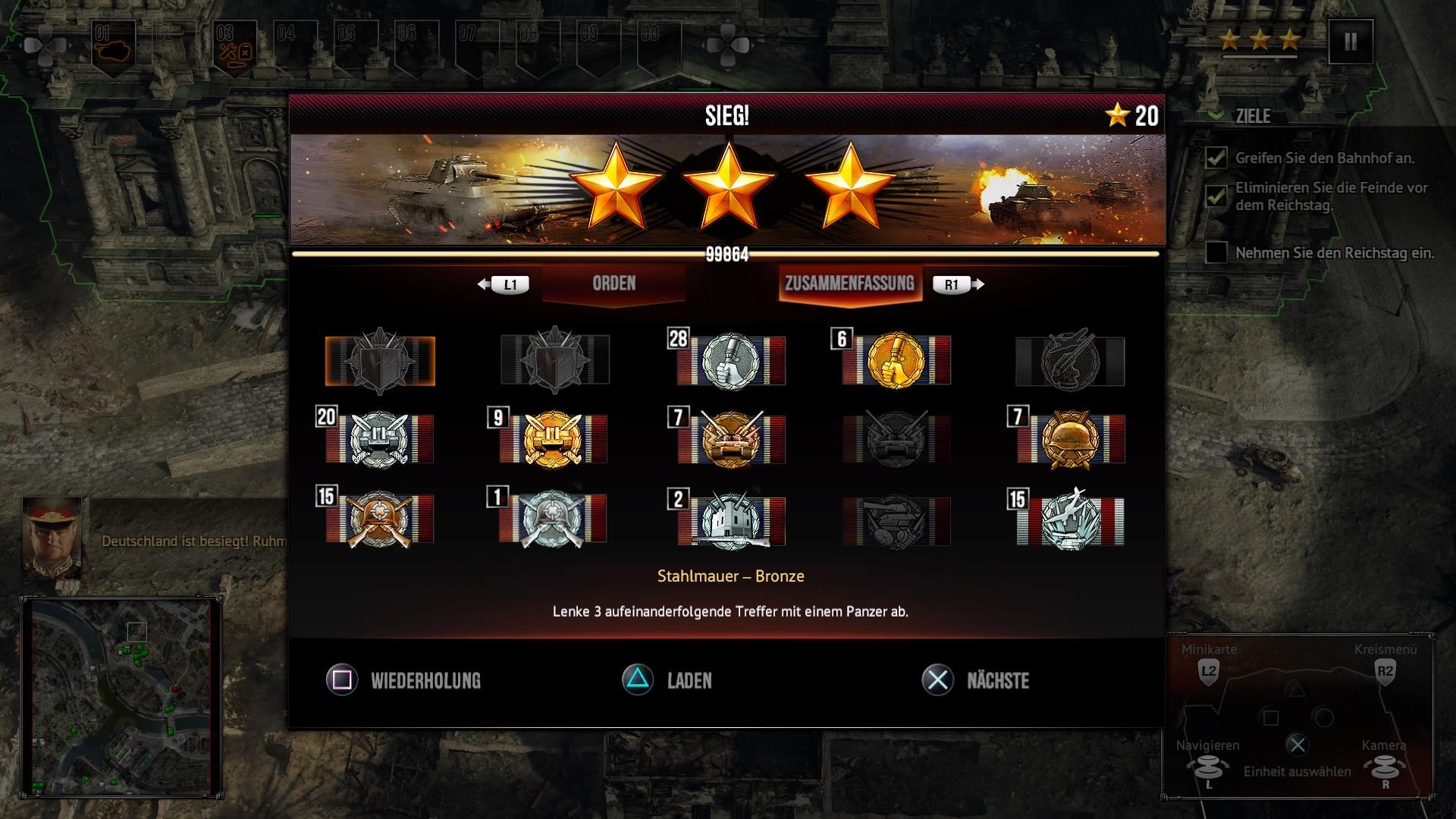 SilentDeath Geschrieben 7. August 2018 Autor Geschrieben 7. August 2018 Mission 7: Spoiler In dieser Mission ist es eure Aufgabe Berlin bzw. den Reichstag einzunehmen. Es gibt einige sehr knifflige Plätze mit viel Infanterie, Flaks, versteckten Einheiten, Minen und oft Chancen, in einen Hinterhalt zu geraten wenn man zu schnell agiert. Hinweise: - Lockt am besten die Infanterie von den Panzern und Geschützen weg, um den anderen Einheiten die Sicht zu rauben. Die vielen versteckten aber dafür unbeweglichen Panzer bieten einige Medaillen für eure 3 Sterne. - Haltet eure Panzer von den Häusern fern! Einige Einheiten sind mit Panzerabwehrwaffen ausgestattet. Nutzt eure Artillerie dafür oder eure Infanterie, um jeweils die Medaille für komplette Vernichtung und für das Versorgen der Truppen zu bekommen. - Einige Stellen sind stark vermint und können euch schnell den ganzen Sieg kosten. Nutzt dafür eure Grenadiere zur Aufklärung und Vernichtung. - Vermeidet zu offene Gefechte, der Gegner hat eine Vielzahl an Einheiten. - Es ist möglich ein äußerst hilfreiches Kriegsgerät der Deutschen zu kapern und per Transportfahrzeug auf der ganzen Karte verwenden zu können. - Solltet ihr die letzte Brücke erreicht haben, bleibt stehen und sendet ein Kampfflugzeug zu den Sandsäcken vor den Reichstag. Die Einheiten werden per Leuchtpistole einige Panzer zu sich rufen, die an den Sandsäcken stehen bleiben. so könnt ihr mit einem Schweren Bomber circa 10 feindliche Panzer auf einmal erledigen. 1. Standort der einsammelbaren 8,8ter: Spoiler 2. Die Minenfelder: (Und jeweils an den Brückenübergängen) Spoiler 3. Die Position für den schweren Bomber: Spoiler 4. Diese Werte sind Richtwerte für 3 Sterne: Spoiler