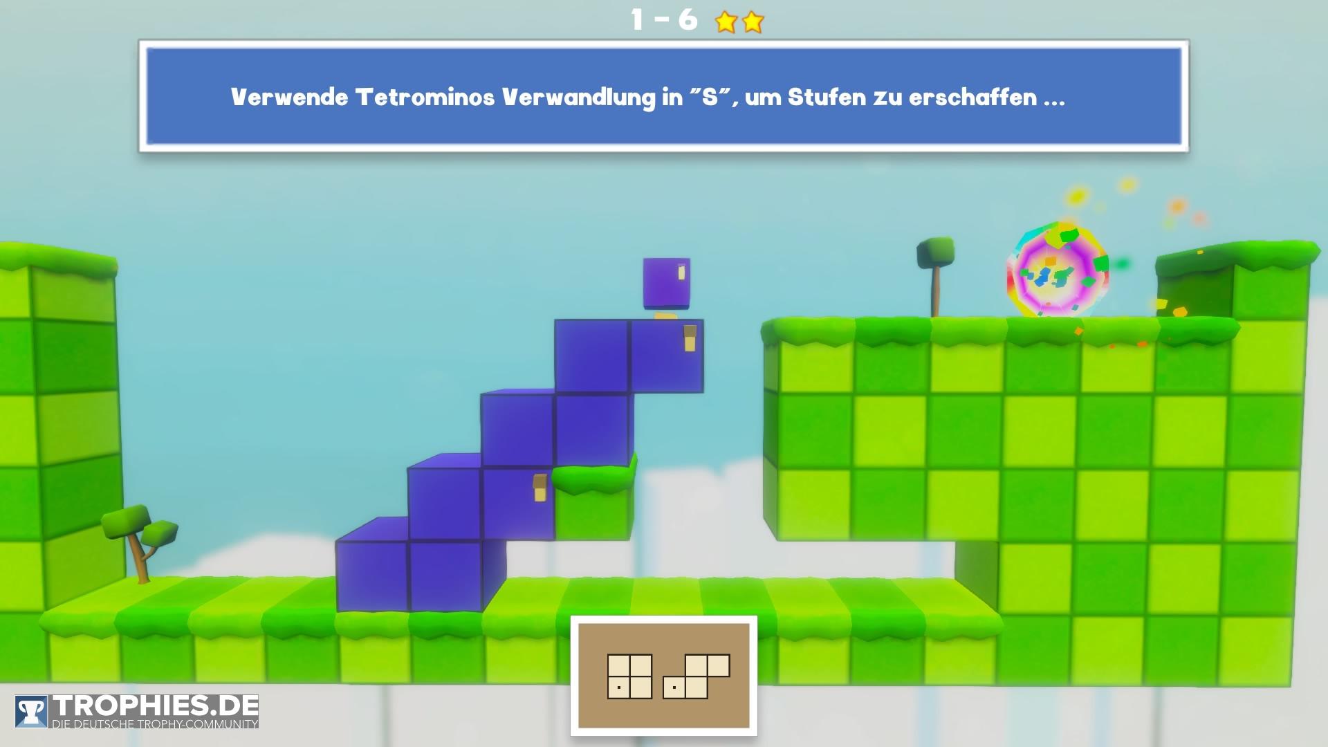 SB-28-SB Geschrieben 10. August 2018 Geschrieben 10. August 2018 (bearbeitet) Trophäen-Leitfaden - Tetra's Escape 1x 8x 9x 4x = 22 | Gesamtpunkte: 1230 Vierfach-Platin möglich durch Versionen PS4 (INT), PS4 (EU), PS4 (AS) und PS-Vita. Trophäen-Infos: Offline-Trophäen: 22 Online-Trophäen: 0 Verpassbare Trophäen: 0 Verbuggte Trophäen: 0 Automatische Trophäen: 10 Allgemeine Infos: Für Platin reicht es, lediglich alle Level bis zur sechsten Welt abzuschließen. Tetras können lediglich nur eine Kiste hoch springen. Dies machen sie aber nur, wenn sie auch vor einer Kiste stehen. freies Springen funktioniert nicht. Fallen Tetras mehr als drei Kisten tief, werden sie selbst zu einer Kiste umgewandelt. Im Hauptmenü gibt es unter "Statistiken" gibt es eine Übersicht, die für manche Trophäen hilfreich sein kann. Siehe Platin-Walkthrough. Siehe Trophäen-Roadmap. Welt 1 Schließe die 1. Welt ab. [Offline-Trophäe] Erhält man automatisch im Spielverlauf, wenn man die acht Level der ersten Welt abgeschlossen hat. Hier ein Videoausschnitt zu allen Leveln der ersten Welt. Erster Pokal Erhalte den 1. Pokal. [Offline-Trophäe] Um diese Trophäe zu erhalten, muss man seinen ersten Pokal in einem Level eingesammelt haben. Hat man in einem Level alle Sterne gesammelt, erscheint an irgendeiner Stelle im Level ein Pokal. Diesen gilt es einzusammeln, bevor man das Portal betritt, andernfalls muss man das ganze Level noch einmal wiederholen und alle Sterne erneut einsammeln, damit der Pokal wieder auftaucht. Erst nachdem man das Portal erreicht hat, wird die Trophäe freigeschaltet. Hinweis: Man kann vorher nicht erkennen, wo der Pokal erscheinen wird. Wenn man sich daher einen Weg mit den Tetras durch das Level bahnt, um an alle Sterne zu kommen, kann es sein, dass man die Tetras zwar alle gut platziert hat, um an die Sterne zu kommen, diese aber schlecht platziert wurden für die Pokale. Daher ist es manchmal notwendig, das Level zu wiederholen wenn man weiß, wo der Pokal auftaucht, um dann planen zu können, wo man sich mit den Tetras hinbewegen muss bzw. wie man die Tetrominos platzieren muss. 10 Tetras gerettet Rette mindestens 10 Tetras (Summe). [Offline-Trophäe] Erhält man automatisch im Spielverlauf, wenn man insgesamt zehn Tetras gerettet hat. Zehn Tetras hat man frühestens nach Level 1-4 gerettet. Und jetzt? Verwandle alle Tetras in Tetrominos und verliere ... [Offline-Trophäe] Hierfür muss man alle Tetras in einem Level zu Tetrominos verwandelt haben. Dies ist frühestens in Level 1-4 machbar. Einen Tetra wandelt man in einen Tetrominos um, indem man drückt. Nun wechselt man mit / bzw. / den Tetra und wiederholt dies, bis alle Tetras zu Tetrominos verwandelt wurden. Hier ein Videoausschnitt dazu. Welt 2 Schließe die 2. Welt ab. [Offline-Trophäe] Erhält man automatisch im Spielverlauf, wenn man die acht Level der zweiten Welt abgeschlossen hat. Hier ein Videoausschnitt zu allen Leveln der zweiten Welt. Welt 3 Schließe die 3. Welt ab. [Offline-Trophäe] Erhält man automatisch im Spielverlauf, wenn man die acht Level der dritten Welt abgeschlossen hat. Hier ein Videoausschnitt zu allen Leveln der dritten Welt. Welt 4 Schließe die 4. Welt ab. [Offline-Trophäe] Erhält man automatisch im Spielverlauf, wenn man die acht Level der vierten Welt abgeschlossen hat. Hier ein Videoausschnitt zu allen Leveln der vierten Welt. Sterne – 25% Erhalte ein Viertel der Sterne. [Offline-Trophäe] Für diese Trophäe muss man 25% aller Sterne, also 48 Stück, im Spiel eingesammelt haben. In jedem Level kann man drei Sterne einsammeln. Sammelt man alle Sterne, schaltet diese Trophäe frühestens nach Abschluss der zweiten Welt frei. Erst nachdem man das Portal im Level erreicht hat, wird die Trophäe freigeschaltet. Diese Trophäe ist mit der Trophäe "Pokale – 25%" kombinierbar. Pokale – 25% Erhalte ein Viertel der Pokale. [Offline-Trophäe] Für diese Trophäe muss man 25% aller Pokale, also 16 Stück, im Spiel eingesammelt haben. Hat man in einem Level alle Sterne gesammelt, erscheint an irgendeiner Stelle im Level ein Pokal. Diesen gilt es einzusammeln, bevor man das Portal betritt, andernfalls muss man das ganze Level noch einmal wiederholen und alle Sterne erneut einsammeln, damit der Pokal wieder auftaucht. Erst nachdem man das Portal im Level erreicht hat, wird die Trophäe freigeschaltet. Diese Trophäe ist mit der Trophäe "Sterne – 25%" kombinierbar. Hinweis: Man kann vorher nicht erkennen, wo der Pokal erscheinen wird. Wenn man sich daher einen Weg mit den Tetras durch das Level bahnt, um an alle Sterne zu kommen, kann es sein, dass man die Tetras zwar alle gut platziert hat, um an die Sterne zu kommen, diese aber schlecht platziert wurden für die Pokale. Daher ist es manchmal notwendig, das Level zu wiederholen wenn man weiß, wo der Pokal auftaucht, um dann planen zu können, wo man sich mit den Tetras hinbewegen muss bzw. wie man die Tetrominos platzieren muss. 100 Tetras gerettet Rette mindestens 100 Tetras (Summe). [Offline-Trophäe] Erhält man automatisch im Spielverlauf, wenn man insgesamt 100 Tetras gerettet hat. 100 Tetras hat man frühestens nach Level fünf in der vierten Welt gerettet. 1.000 Bewegungen Laufe über 1.000 Kisten (Summe). [Offline-Trophäe] Hierfür muss man insgesamt über 1.000 Kisten gelaufen sein. Mit Kisten sind die zweifarbigen in abwechselnder Reihenfolge angeordneten Würfel gemeint, aus denen ein Level aufgebaut ist. Etwas vergessen? Schließe ein Level ohne Sterne ab. [Offline-Trophäe] Damit man diese Trophäe erhält, muss man ein Level abgeschlossen haben, ohne dass man einen einzigen Stern eingesammelt hat. Das Level 3-2 eignet sich besonders gut dafür. Ein Bild dazu im Spoiler: Spoiler Der Boden ist Lava Verbrenne alle Tetras in einem Level. [Offline-Trophäe] Um diese Trophäe zu erhalten, muss man alle Tetras in einem Level verbrannt haben. Damit man ein Tetra verbrennt, muss man mit diesem ins Feuer laufen. Am frühesten kann man