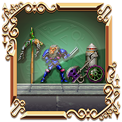 - In einem Raum, welcher diagonal entlang geht, findet man neben den Skeletten, die diagonal Feuer speien, fast ganz oben eine Spießkugel, die man auch zerstören kann. Diese Spießkugel hinterlässt diese Axtherrenrüstung. Die Spießkugel ist übrigens nicht für die Ergänzung der Feindesliste und somit den Erhalt der Trophäe "Vom Axt-Ritter zum Untoten" relevant.