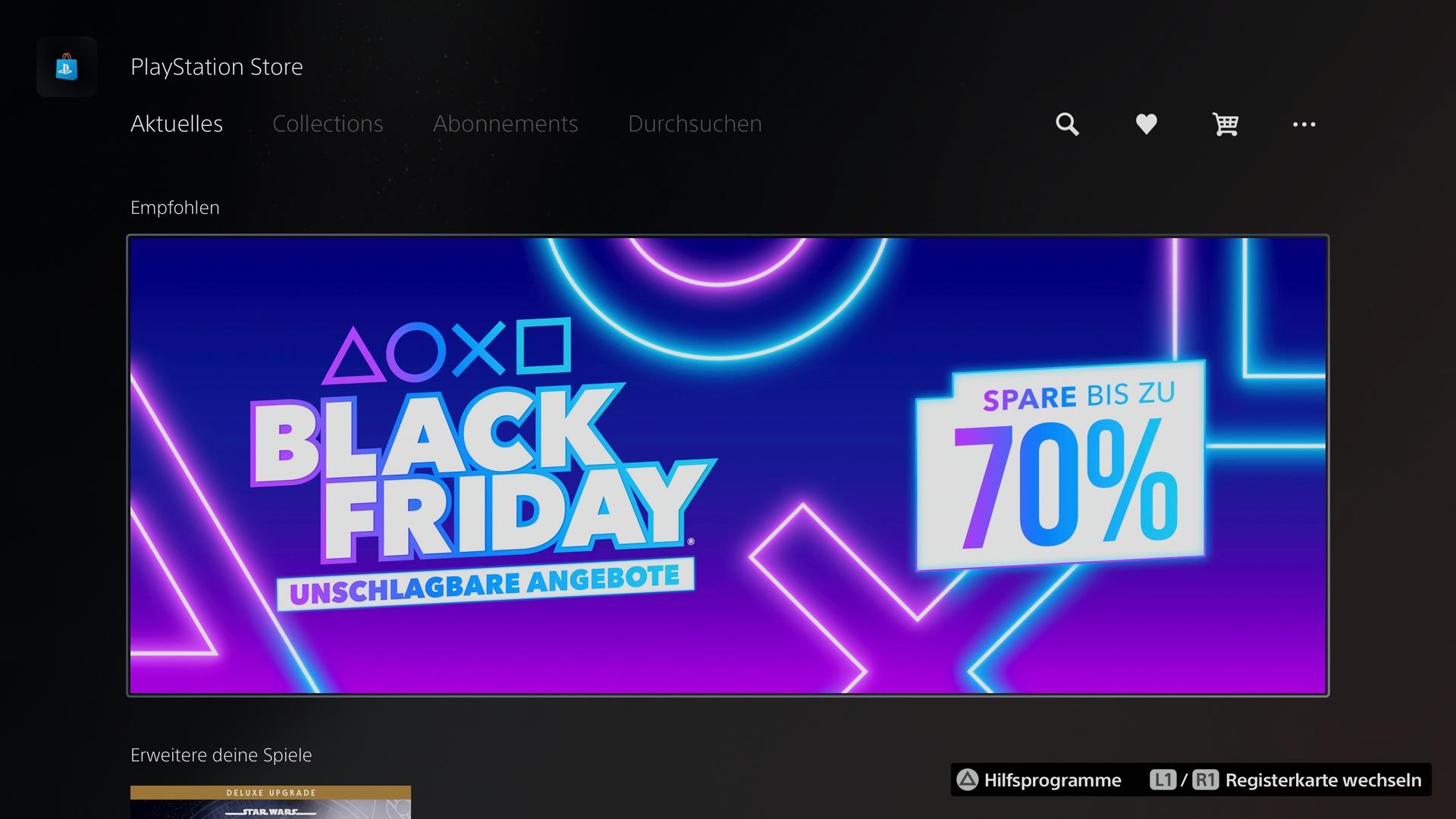 Blacky Geschrieben 22. November 2020 Geschrieben 22. November 2020 Wo finde ich denn auf der PS5 in dem Store die ganzen Angebote wie bspw. Planet der Rabatte oder Black Friday Sale? Der Black Friday Sale war nur kurz mal bei Empfehlungen, war dann wieder weg und ich hab nirgends einen Reiter für Angebote gefunden, vllt weiß ja jemand was.