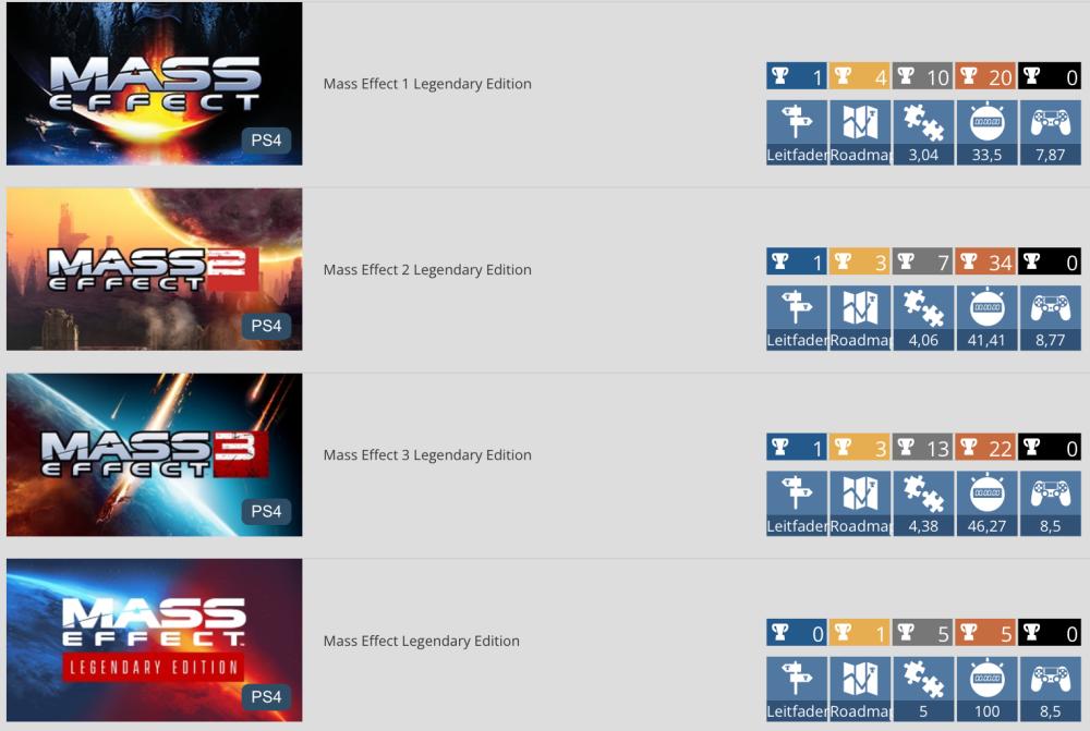 stiller Geschrieben 27. August 2022 Geschrieben 27. August 2022 Hiermit möchte ich meine Teilnahme an dem Event "Trophies.de | 100% Club Games #2" bestätigen und melde folgende Spiele vorab an: PSN-ID: stiller2010 Spieleanmeldung Spiel 1: Mass Effect 1 Legendary Edition PS4 Mass Effect 1 Legendary Edition - Trophies.de - PS5, PS4, PS3 & PS Vita Trophäen-Forum Schwierigkeit 3,04 Zeitaufwand 33,50 Spiel 2: Mass Effect 2 Legendary Edition PS4 Mass Effect 2 Legendary Edition - Trophies.de - PS5, PS4, PS3 & PS Vita Trophäen-Forum Schwierigkeit 4,06 Zeitaufwand 41,41 Spiel 3: Mass Effect 3 Legendary Edition PS4 Mass Effect 3 Legendary Edition - Trophies.de - PS5, PS4, PS3 & PS Vita Trophäen-Forum Schwierigkeit 4,38 Zeitaufwand 43,27 Spiel 4: Mass Effect Legendary Edition PS4 Mass Effect Legendary Edition - Trophies.de - PS5, PS4, PS3 & PS Vita Trophäen-Forum Schwierigkeit 5,00 Zeitaufwand 100,00 Weil's grade beim letzten Titel eine "knappe Kiste" ist, hier der entsprechende Screenshot dazu: Spoiler 4 1