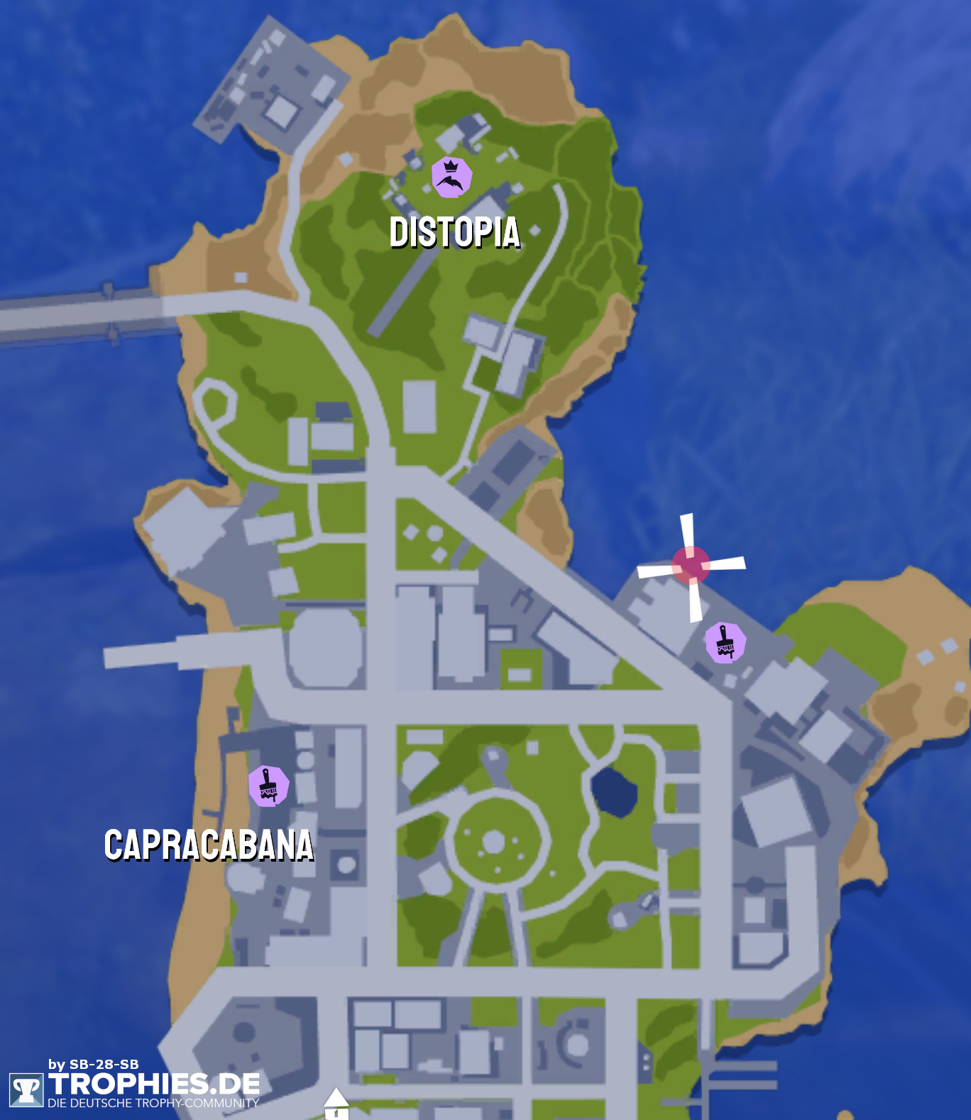 - Fundort "The Destroyer": Nordöstlich in der Region "Suburbsville" in der kleinen Parkanlage neben dem gelben Haus auf einer Parkbank: