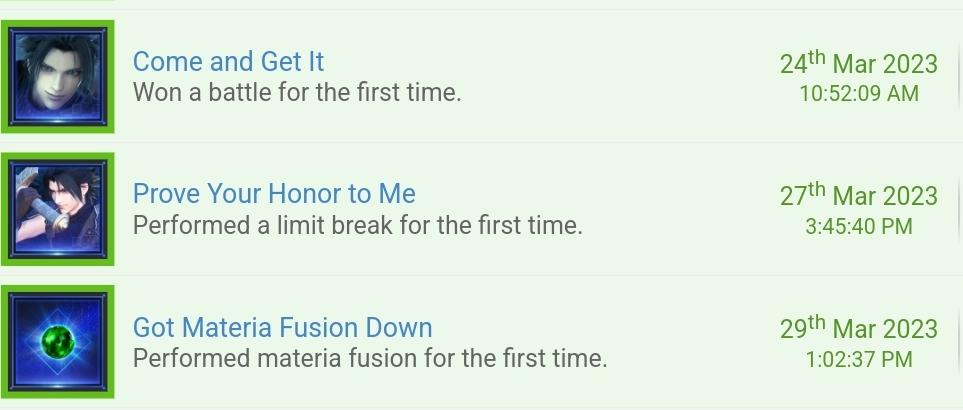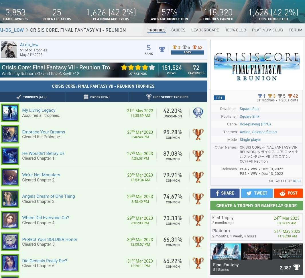 AiMania Geschrieben 5. Juni 2023 Autor Geschrieben 5. Juni 2023 Fertigmeldung: Crisis Core Final Fantasy 7 Reunion (Neues Spiel) PS4 Folgende Event-Trophäen möchte ich fertig melden: N01 Komplettierung von 25 bis 70% N05 SG zwischen 4 und 8 N09 Spielzeit Über 40 Stunden C01 Spiel bewertet C02 Spiel befindet sich auch in der Liste von @Hawaiitianer V04 Spiel aus einer Reihe in der ich schon Platins habe: Final Fantasy V05 Zwei Spiele einer Reihe: Crisis Core PS4 und Theatrhythm aus Final Fantasy V10 NG+ oder "schwer" E02 Erspiele 5 Trophäen mit First/Erster etc. KeyWe PS4 - Learn the Ropes - Complete the First Week of Summer Wobbly life - A Wobbly Start - Complete Jelly Job Crisis Core PS4 - Come and get it - Won a battle for the first time Crisis Core PS4 - Prove Your Honor to me - Performed a limit break for the first time Crisis Core PS4 - Got Materia Fusion Down - Performed materia fusion for the first time Nachweise: Spoiler Crisis Core PS4 KeyWe PS4 Wobbly life . Spoiler 2 1 Zitieren