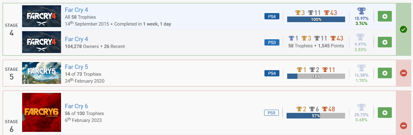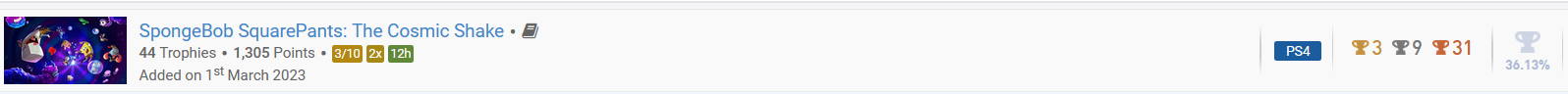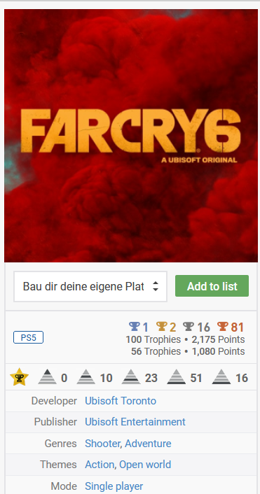 john_cena1993 Geschrieben 17. Februar 2023 Autor Geschrieben 17. Februar 2023 Planertabelle Hinweis für Vorschläge: Keinen Spielvorschlag mehr frei. Letzte Aktualisierung: 05.03.2023 19:41 Uhr ---------------------------------------------- Neue Spiele Spoiler N1 - Kleinigkeit 5x Alex Kidd in Miracle World DX - PS5 - 0% | Schnitt: 25,92% Alex Kidd in Miracle World DX - PS4 - 0% | Schnitt: 35,46% N2 - Challenge 4x Final Fantasy IX - 0% | Schnitt: 7,39% N4 - Null Problemo 5x Alex Kidd in Miracle World DX - PS5 - 0% | SG: 3 Alex Kidd in Miracle World DX - PS4 - 0% | SG: 3 N6 - Viel Problemo 3x Final Fantasy IX - 0% | SG: 8,48 N7 - Sprint 5x Alex Kidd in Miracle World DX - PS5 - 0% | ZA: 6,33 Std. Alex Kidd in Miracle World DX - PS4 - 0% | ZA: 6,33 Std. N9 - Marathon 3x Final Fantasy IX - 0% | ZA: 67,24 Std. Backlog Spiele Spoiler B1 - Piece of Cake 5x Far Cry 6 - 98% | 25,60% B2 - Cake my Day 4x Dying Light 2 - 47% | 5,83% Zombie Army 4 - 46% | 8,19% B3 - The Cake is a Lie 3x WWE Smackdown vs. Raw 2011 - 3% | 4,10% → Mann der 1004 Griffe | 2 unmögliche Trophäen Prototype - 2% | 3,08% [indiziert!] Tomb Raider - PS3 - 35% | 4,87% B4 - Easy Road 5x Far Cry 6 - 98% | SG: 2,91 Dying Light 2 - 47% | SG: 3,91 B6 - Hard Highway 3x Prototype - 2% | SG: 8,06 [indiziert!] Catherine - PS3 - 25% | SG: 9,02 B7 - Neubau 5x Far Cry 6 - 98% | 28.03.2022 Dying Light 2 - 47% | 03.02.2022 Alan Wake - 30% | 17.01.2022 The Artful Escape - 40% | 05.06.2022 Kena Bridge of Spirits - 70% | 06.05.2022 B8 - Altbau 4x Far Cry 5 - 11% | 05.02.2020 Marvel Avengers - 49% | 07.06.2021 Lego Harry Potter - 51% | 19.05.2021 Jurassic World Evolution - 82% | 07.01.2020 B9 - Historischer Bau 3x Red Dead Redemption 2 - 84% | 26.10.2018 WWE Smackdown vs. Raw 2011 - 3% | 12.11.2010 Prototype - 2% | 24.05.2012 [indiziert!] Verschiedenes Spoiler V1 - Mehr Content! Far Cry 6 - Salt of the Earth - 0% Far Cry 6 - Party Crasher - 0% Far Cry 6 - Vaas:Wahnsinn - 61% Far Cry 6 - Pagan: Kontrolle - 0% Far Cry 6 - Joseph: Kollaps - 0% V2 - Noch mehr Content... Far Cry 6 DLC 1-3 Far Cry 6 - Salt of the Earth - 0% Far Cry 6 - Party Crasher - 0% Far Cry 6 - Vaas:Wahnsinn - 61% Far Cry 6 DLC 4-6 Far Cry 6 - Pagan: Kontrolle - 0% Far Cry 6 - Joseph: Kollaps - 0% Far Cry 6 - Lost Between Worlds - 0% V3 - Einmal Alles bitte Far Cry 6 Hauptspiel - 98% Salt of the Earth - 0% Party Crasher - 0% Far Cry 5 Hauptspiel - 11% Düstere Stunden - 0% Lost on Mars - 0% V4 - Kenn ich, mag ich Far Cry 6 - 98% Bereits fertig: Far Cry 2, Far Cry 3 & Far Cry 4 Final Fantasy IX - 0% Bereits fertig: Final Fantasy X, Final Fantasy X-2, Final Fantasy XIII & Final Fantasy XIV V5 - SerienFan Far Cry Spielreihe Far Cry 6 - 98% Far Cry 5 - 11% Final Fantasy Spielreihe Final Fantasy IX - 0% Final Fantasy XII - 20% V6 - Community Spoiler C1 - Bewertet! unbegrenzt Legende: - bewertet | - noch nicht bewertet Spoiler noch keine Spiele fertig C2 - Was hast du da schönes? 5x Far Cry 6 - 100% In der Liste von @Chrissy Zombie Army 4 - 46% In der Liste von @AiMania C3 - Probier das Mal 5x Hogwarts Legacy - 0% Vorschlag an @Chrissy Life is Strange Before the Storm 0% Vorschlag an @d4b0n3z Dungeon Hunter Alliance - 79% Vorschlag an @Pittoresque Yum Yum Cookstar - 0% Vorschlag an @AiMania Story of Seasons Pioneers of Olive Town - 0% Vorschlag an @Vanyar1 C4 - Ich mach das tatsächlich 5x Final Fantasy IX - 0% Vorschlag von @d4b0n3z Doraemon: Friends of the Great Kingdom - 0% Vorschlag von @tadini Marvels Guardians of the Galaxy - 0% Vorschlag von @Blacky Burnout Paradise PS4 EU - 22% Vorschlag von @Tomekk20 The Quarry - 0% Vorschlag von @Vanyar1 Easter Eggs Spoiler Screenshots Spoiler Zitieren