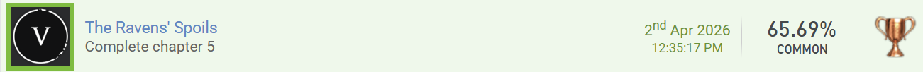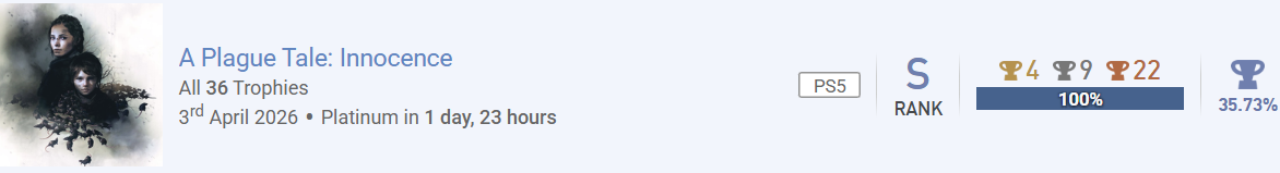 Vanyar1 Geschrieben 11. März Autor Geschrieben 11. März Heyho Eine kleine Anmerkung, die für deine Meldungen relevant ist - ich weiß gar nicht, wieso mir das vorher nicht aufgefallen ist. Die Komplettierungsrate für die Eventtrophäen ist nicht die Average Completion, sondern die Prozentangabe der Platin. Im Falle von Stormrise also die Angabe rechts: Ich werde das Bild auch mal als Beispiel in den Event-Leitfaden mit einfügen. Entsprechend sind es bei manchen Spiele andere (wertvollere) Eventtrophäen, die bei deinen Spielen zum Tragen kommen. Ich habe deine Einträge in deiner Tabelle bereits angepasst, hier aber auch nochmal die Auflistung: Cult of the Lamb von P7 auf P8 CoD BO7 von P7 auf P8 Back to the Future ist weiterhin P7 GTA 4 von P8 auf T9 Stormrise von P8 auf T9 Stray bleibt bei S3 Star Wars bleibt bei N8 1 Zitieren