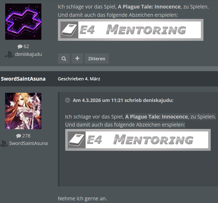 deniskajudu Geschrieben 13. März Geschrieben 13. März Am 3.3.2026 um 19:52 schrieb deniskajudu: 2X Ich habe T3 2x fertig gemeldet. Es wurde nur ein mal eingetragen. Hier musste ich das Hauptspiel und dann das DLC auf einem Höherem Schwierigkeitsgrad abschließen. Hiermit erspiele ich folgende Abzeichen mit dem Spiel The Evil Within: The Evil Within ist an sich schon unheimlich. Also auch Düster Hier nur wenn Star Wars doch nicht passen sollte melde ich das Abzeichen hier sicherheitshalber nochmal. 1 Zitieren