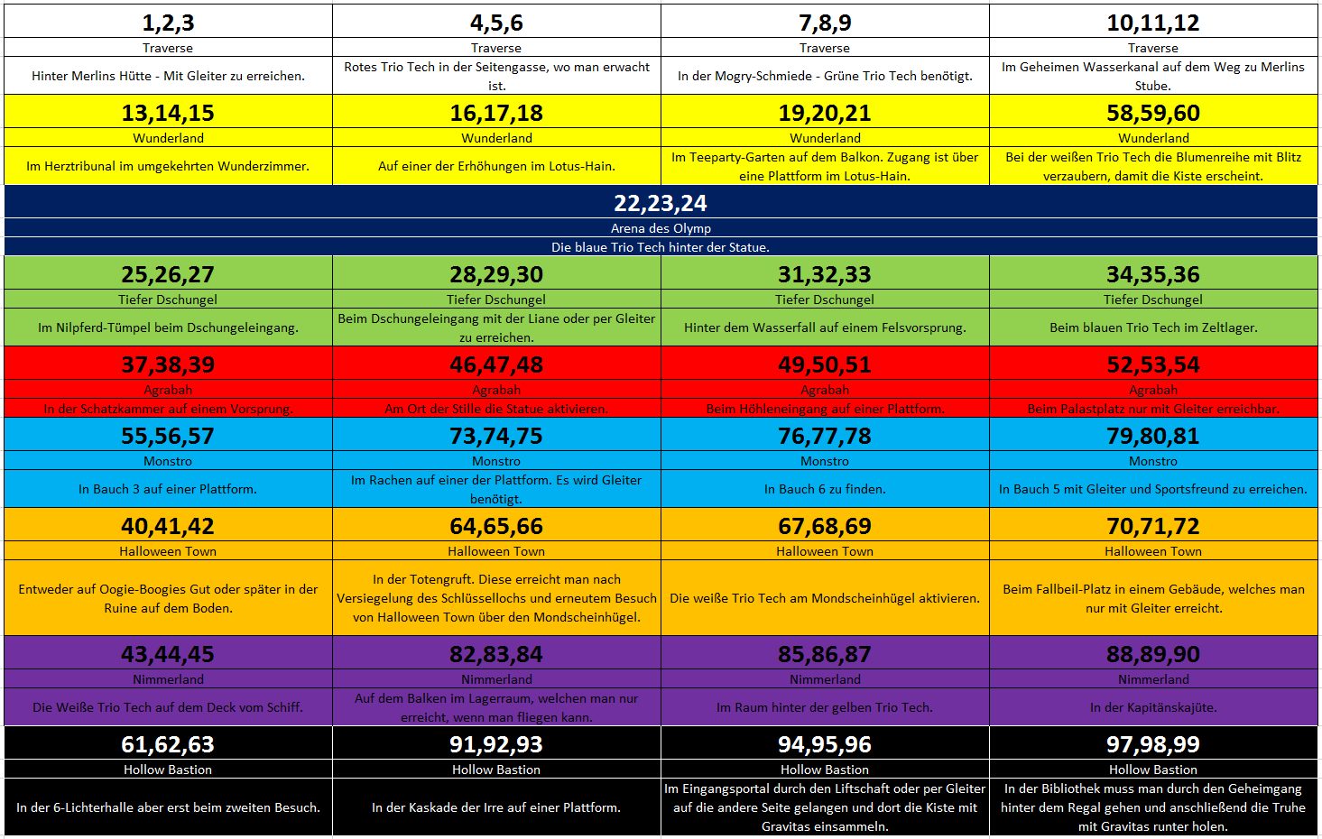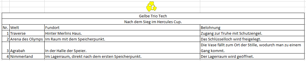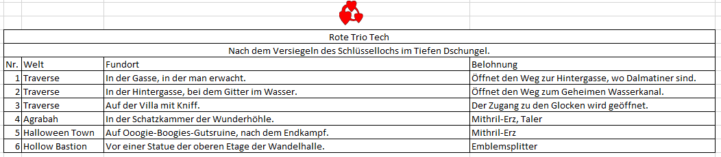 Cetra Geschrieben 10. September 2013 Geschrieben 10. September 2013 (bearbeitet) Trophäen-Leitfaden - Kingdom Hearts Final Mix 1x 2x 4x 49x = 56 Doppelplatin möglich durch Versionen PS3 und PS4. Trophäen-Infos: Offline-Trophäen: 56 Online-Trophäen: 0 Verpassbare Trophäen: 40 Verbuggte Trophäen: 0 Automatische Trophäen: 13 Allgemeine Infos: Legt man sich vor dem Endgegner einen Speicherstand an, sind nur noch drei Trophäen verpassbar: "Ungeschlagen", "Unveränderte Ausrüstung" und "Flitzer". Ihr legt gleich zu Beginn fest, wie hoch die Statuswerte am Anfang sind, in welcher Reihenfolge ihr eure Abilities erlernt und in welchem Maße euer Level steigt (wie viele EXP man zum nächsten Level braucht). Die ersten beiden durch die Waffenwahl und letzteres durch die Fragen der drei Kinder auf der Trauminsel. Die Dämmerung morgens steht für einen frühen Level Up zu Beginn und einen späteren auf höheren Leveln (knapp in der Mitte der 40er bis zum Schluss), Mittag steht für einen normalen Anstieg und der Anbruch der Nacht, die Abenddämmerung steht für einen langsamen Anstieg am Anfang und einen schnellen am Schluss. Der Soft-Reset wird mit + + + + + gemacht. Mit diesem findet man sich gleich im Hauptmenü wieder, was man gut gebrauchen kann, sofern man sich das Ein- und Ausschalten während der Sidequests oder beim Scheitern einer Aufgabe ersparen will. Nach Abschluss von Nimmerland kann man in Kämpfen Tinkerbell rufen, welche einen kontinuierlich heilt und gleichzeitig bei Kampfunfähigkeit dafür sorgt, dass man einmalig wiederbelebt wird. Allerdings muss man, um "Rufen" nutzen zu können, Donald und Goofy im Team haben. Siehe Sammelthread für Bosse und Sidequests (Dalmatiner, Triogramme, Schmiede, Baupläne, etc.). Siehe Schmiedeitem Übersicht. Siehe Gumi-Jet-Hilfe. Siehe Hilfe und Infos zu Kingdom Hearts Final Mix. Anfängerspieler Final Mix im Schwierigkeitsgrad Anfänger abgeschlossen. [Offline-Trophäe] Erhält man automatisch im Spielverlauf, wenn man das Spiel im Anfänger-Modus durchgespielt hat. Man startet sofort zu Beginn mit jeweils acht Kraftbolzen und Schutzengel sowie vier Abilitamin, einer Schleife und einem EXP-Accessoire. Dadurch wird der Modus noch einmal erleichtert. Bei der PS3-Version erhält man diese Trophäe nicht, wenn man das Spiel auf einem höheren Schwierigkeitsgrad abschließt, bei der PS4-Version hingegeben schon. Hinweis: Man erhält die Trophäe erst nach den Credits, wenn der Endbildschirm angezeigt wird. Wenn die Glocken läuten Das Schlüsselloch in Traverse Town verschlossen. [Offline-Trophäe] Erhält man automatisch im Spielverlauf, wenn man das Schlüsseloch in Traverse versiegelt hat. Zuvor muss man noch den Rüstorpanzer besiegen. Dies ist während des zweiten Besuchs in Traverse. Hinweis: Man erhält die Trophäe erst, wenn man die Weltkarte betritt. Der Kaninchenbau Das Schlüsselloch im Wunderland verschlossen. [Offline-Trophäe] Erhält man automatisch im Spielverlauf, wenn man das Schlüsseloch im Wunderland versiegelt hat. Zuvor muss man den Stelzenknüppler besiegen. Hinweis: Man erhält die Trophäe erst, wenn man die Weltkarte betritt. Junior-Helden Das Schlüsselloch in der Arena des Olymp verschlossen. [Offline-Trophäe] [Verpassbare Trophäe] Diese Trophäe erhaltet ihr nach der Versiegelung des Schlüssellochs der Arena des Olymp auf der Weltenkarte. Dafür braucht ihr die Gelbe Trio-Tech aus dem Hercules-Cup und müsst den Sockel in der Eingangshalle dadurch verschieben. Zuerst müsst ihr allerdings ein Training (zwei Kurse) absolvieren, in welchem ihr Fässer in vorgegebener Zeit zerstören müsst. Dann warten die Vorrunden auf euch, welche mit den Kämpfen gegen Cloud und Kerberos enden. Der Hercules-Cup ist verfügbar, sobald ihr die Schlüssellöcher in Halloween Town und Nimmerland versiegelt habt. Gruppenmitglied Das Schlüsselloch im Tiefen Dschungel verschlossen. [Offline-Trophäe] Erhält man automatisch im Spielverlauf, wenn man das Schlüsseloch im Tiefen Dschungel versiegelt hat. Zuvor muss man Clayton und seinen Gefährten besiegen. Im Anschluss daran muss man noch die Höhle hinter dem Wasserfall erklimmen, um zum Herzen der Welt zu gelangen. Hinweis: Man erhält die Trophäe erst, wenn man die Weltkarte betritt. Wunderlampe Das Schlüsselloch in Agrabah verschlossen. [Offline-Trophäe] Erhält man automatisch im Spielverlauf, wenn man das Schlüsseloch in Agrabah versiegelt hat. Zuvor muss man noch Dschafar besiegen. Hinweis: Man erhält die Trophäe erst, wenn man die Weltkarte betritt. Ehrlich währt am längsten Aus Monstros Bauch entkommen. [Offline-Trophäe] Erhält man automatisch im Spielverlauf, wenn man das Monstro-Szenario beendet hat. Zuvor muss man noch den Parasitakel zwei Mal besiegen. Hinweis: Man erhält die Trophäe erst, wenn man die Weltkarte betritt. Meister der Meere Das Schlüsselloch in Atlantica verschlossen. [Offline-Trophäe] [Verpassbare Trophäe] Erhält man automatisch im Spielverlauf, wenn man das Schlüsselloch in Atlantica verschlossen hat. Zuvor muss man noch Ursula besiegen. Prinz der Albträume Das Schlüsselloch in Halloween Town verschlossen. [Offline-Trophäe] [Verpassbare Trophäe] Erhält man automatisch im Spielverlauf, wenn man das Schlüsselloch in Halloween Town verschlossen hat. Zuvor muss man Oogie Boogie besiegen. Feenglanz Das Schlüsselloch in Nimmerland verschlossen. [Offline-Trophäe] Erhält man automatisch im Spielverlauf, wenn man das Schlüsselloch in Nimmerland versiegelt hat. Zuvor muss man Captain Hook besiegen und im Anschluss den Big Ben besuchen. Hinweis: Man erhält die Trophäe erst, wenn man die Weltkarte betritt. Puuhs Freund Das Schlüsselloch im Hundertmorgenwald verschlossen. [Offline-Trophäe] [Verpassbare Trophäe] Erhält man, nachdem man das Schlüsselloch vom 100-Morgen-Wald versiegelt hat. Um ihn zu beenden, muss man alle fünf verlorenen Seiten finden und die jeweiligen Aufgaben in der Welt abschließen. Traverse, 51 Dalmatiner fi
